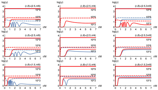 It might be interesting whether to escape near a threshold ; however, we focus on particle acceleration for a sufficiently large value of . Hereafter, we set , , and . Figure 3 shows the evolution of the Lorentz factor as measured by FIDO. The top panels from the left to the right show the results for the initial position M, , M, , and M, 3 in the Schwarzschild spacetime. For the strong case , or , the particle is accelerated in a moment, whereas the particle is alternatively accelerated or decelerated for . This behavior originates from bounces of the -motion.