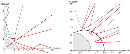 Examples of trajectories in the plane. The trajectory of the positively charged particles is shown by the blue curve, whereas that of negatively charged particle is shown by the red curve. The left panel shows the results for in Schwarzschild spacetime. The initial positions are M, , M, , and M, . The black dotted line represents . The right panel shows results for (dotted curve) and (solid curve) in the Kerr spacetime with M. The initial positions are M, , M, , and M, 3. The evolution of the Lorentz factor for these parameters are shown in the bottom panels in Figure 3. The horizon and ergo-region are shown by the black curve.