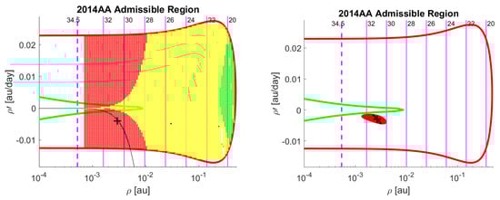 - Milani, A.; Gronchi, G.F.; Vitturi, M.D.; Knežević, Z. Orbit determination with very short arcs. I admissible regions. Celest. Mech. Dyn. Astron. 2004, 90, 57–85. [Google Scholar] [CrossRef]