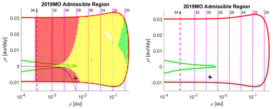Figure 3. Tool 1 tested on tracklets of four observations (left) and seven observations (right) for asteroid 2019MO. - 2018LA: a small Apollo-type NEA discovered by the Mt. Lemmon Survey on 2 June 2018. Only 8 h later, it impacted the Earth’s atmosphere over Botswana, becoming the third imminent impactor ever detected and the first opportunity to test NEOScan on a real case. The object could not be detected before it came very close to the Earth due to its high entry velocity and small size (the estimated diameter was of a few metres). In the following hours after the first observational data were published on the NEOCP, follow-up observations were performed and four tracklets were obtained. Results of the four runs of Tool 1 over the tracklets of 3, 11, 12 and 14 observations are shown in Figure 4.