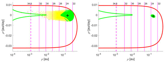 - Green line: inner boundary of the AR, left of which the object would be a satellite of the Earth;