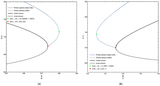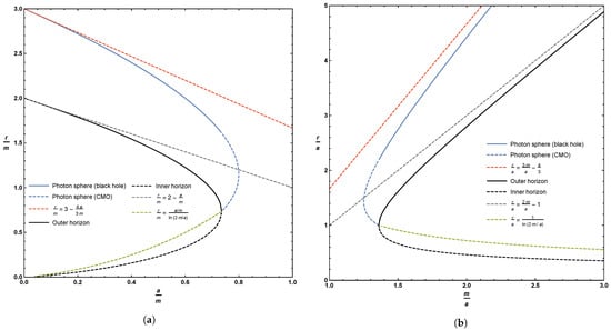 Location of the photon sphere, inner horizon, and outer horizon. Sub-figure (a) plots these quantities as a function of the parameter a; sub-figure (b) plots these quantities as a function of the parameter m. The dashed blue line represents the extension of the photon sphere to horizonless compact massive objects (CMOs), whilst the dashed red line is the asymptotic solution for small values of the parameter a (Equation (21)). The dashed grey line is the asymptotic solution to the outer horizon for small values of a (Equation (5)). The dashed green line is the simple analytic bound and asymptotic estimate for the location of the inner horizon (Equations (7) and (10)).