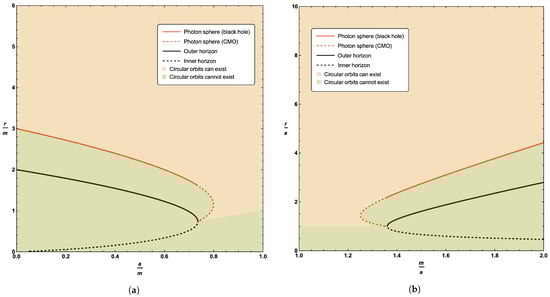 The inner and outer horizons merge at , i.e., at . For , i.e., for , one is dealing with a horizonless compact object and we see that there is a region where there are two circular photon orbits. Note that the curve described by the loci of circular photon orbits terminates once one hits a horizon, i.e., at . Sub-horizon curves of constant r are spacelike (tachyonic), and cannot be lightlike, so they are explicitly excluded. That is, photon spheres can only exist in the region .