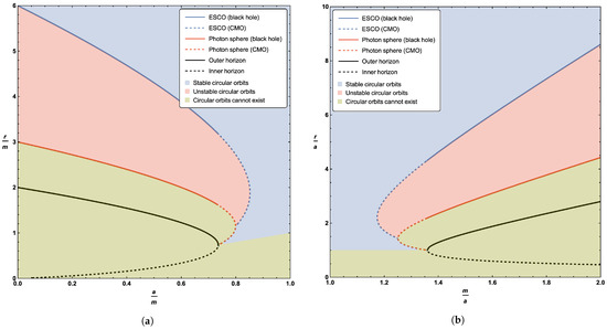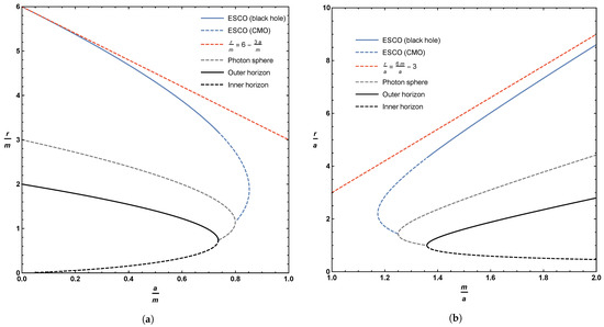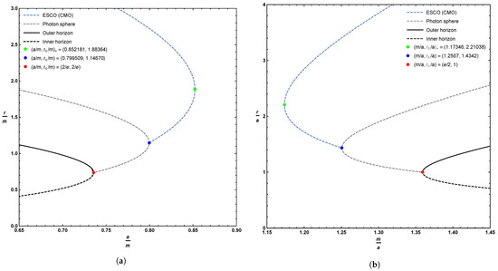 Plots of the boundary implied by Equation (44), or equivalently (49), can be seen in Figure 4. As for the photon sphere, we have the interesting result that the extension of the ESCO to horizonless compact massive objects results in up to two possible ESCO locations for fixed values of a and m. Perhaps unexpectedly, the curve of ESCOs does not terminate at the horizon—it terminates once it hits the curve of circular photon orbits at a very special point. Let us now turn to the detailed analysis of both the qualitative behavior and the various turning points presented in Figure 4 and Figure 5. Note that where the ESCO is single-valued, it is an ISCO (innermost stable circular orbit). Where the ESCO is double-valued, the upper branch is an ISCO and the lower branch is an OSCO (outermost stable circular orbit) [71].