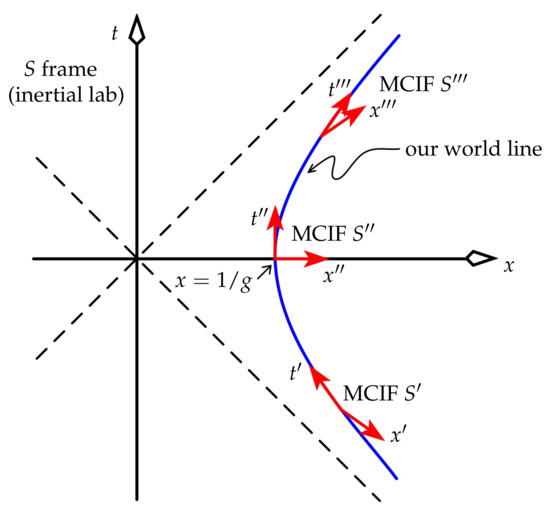 - Hamilton, J.D. The uniformly accelerated reference frame. Am. J. Phys. 1978, 46, 83–89. [Google Scholar] [CrossRef]