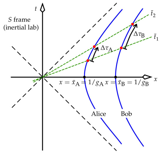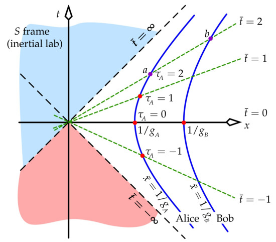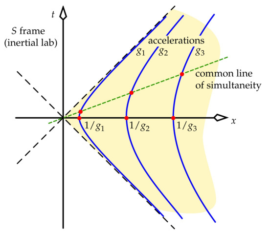The time on the master clock—arbitrarily chosen as that of Alice—dictates what the other clocks display. When (which happens at from (8), whose becomes ), all of the UAF’s observers are “crossing the x-axis” in spacetime (i.e., coming momentarily to rest in the lab), and all agree on this. Hence, all of their clocks are set to display when . We set , the unchanging position of observer i in , to be that observer’s value of x at this time, which is . Thus, observers stationed far “above” Alice (large x or ) accelerate much less strongly than she does.