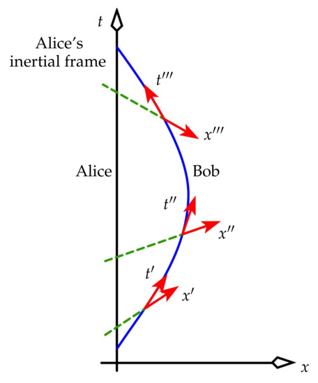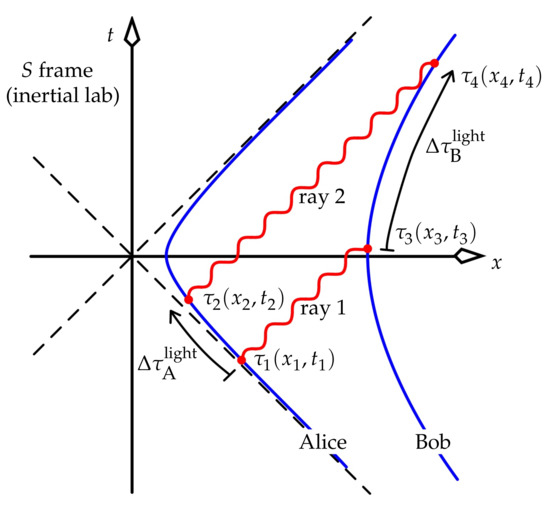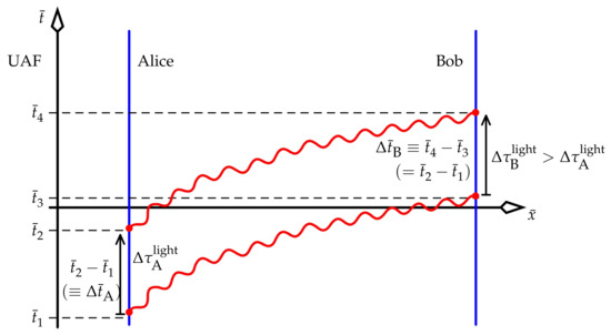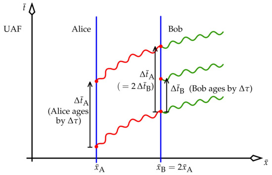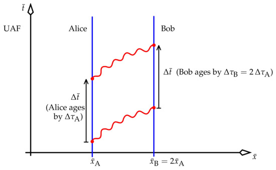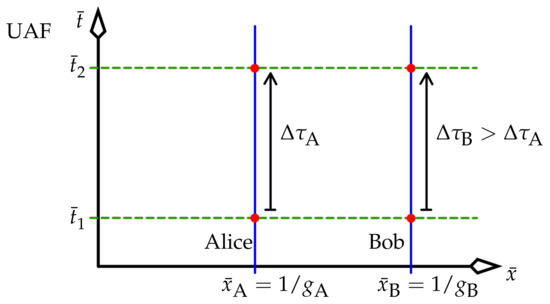 Thus, , which can be treated as the reciprocal of a generalised gamma factor for the UAF. Focus on Alice and Bob, both stationary in the UAF, where Alice is now no longer the master observer. Then for each, and (25) becomes