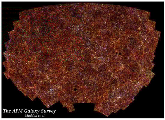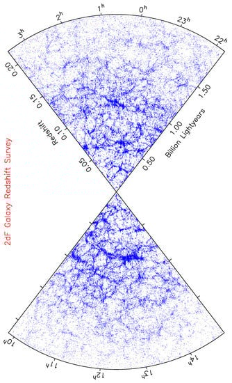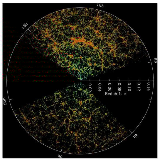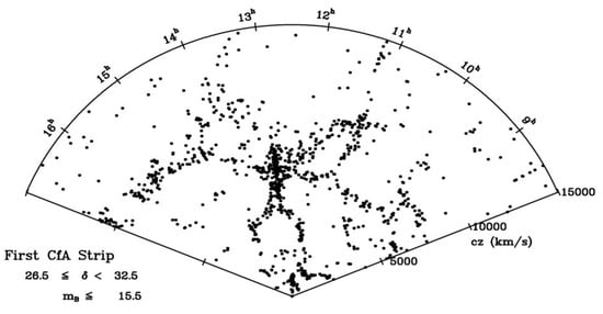 A landmark in observational cosmology was set by the redshift survey due to de Lapparent, Geller and Huchra (the CfA survey of 1986 and 1988) [,]. Even if it was only “A slice of the Universe”, and even if it was a map at so large scale that just consisted of a distribution of black dots (each one corresponding to a whole galaxy), in this slice one could see, for the first time, the large-scale structure of our cosmos—a map of the universe in front of us for the very first time ever (Figure 2).
