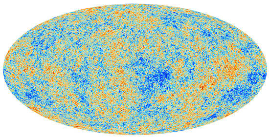 Probably, the first serious attempts to measure the possible curvature of the physical space go back to Gauss. With vertexes placed on the peaks of three German mountains, Brocken, Inselberg, and Hohenhagen, he tried to measure the sum of the three angles of the triangle that was formed. He was in search for evidence that the geometry of space was non-Euclidean. But one needs a much bigger triangle in order to find the possible non-zero curvature of space and the idea, although extremely brilliant for the time, was condemned to failure. More recently, cosmologist have measured the curvature radius R by using the largest triangle available at present, which is namely one with us at one vertex and with the other two situated on the hot opaque surface of the ionized hydrogen that delimits our visible universe and emits the CMB radiation, from some 370 to 380 thousand years after the Big Bang []. As is known, the CMB maps exhibit hot and cold spots (see Figure 6). It can be shown that the characteristic spot angular size corresponds to the first peak of the temperature power spectrum, which is reached for an angular size of (approximately the size subtended by the Moon) if space is taken to be flat. Spots should be larger (with a corresponding displacement of the position of the peak), if space has in fact a positive curvature, and correspondingly smaller if its curvature is negative.