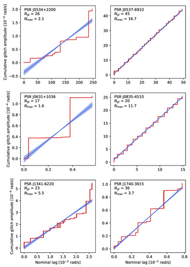 - Fuentes, J.R.; Espinoza, C.M.; Reisenegger, A. Glitch time series and size distributions in eight prolific pulsars. Astron. Astrophys. 2019, 630, A115. [Google Scholar] [CrossRef]