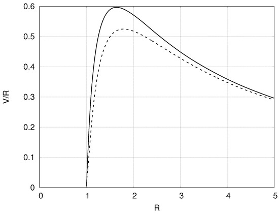 Dependence of the ratio on R at (solid line) and (dashed line). All the geometrical values are expressed in units of radius of the star at the pole . Velocity is expressed in Kepler velocity at the pole.