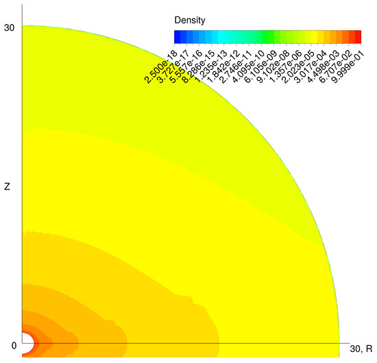 Logarithm of dimensionless density of plasma in the upper hemisphere of the computational domain. All the geometrical values are expressed in units of radius of the star at the pole . corresponds to the sound velocity . .