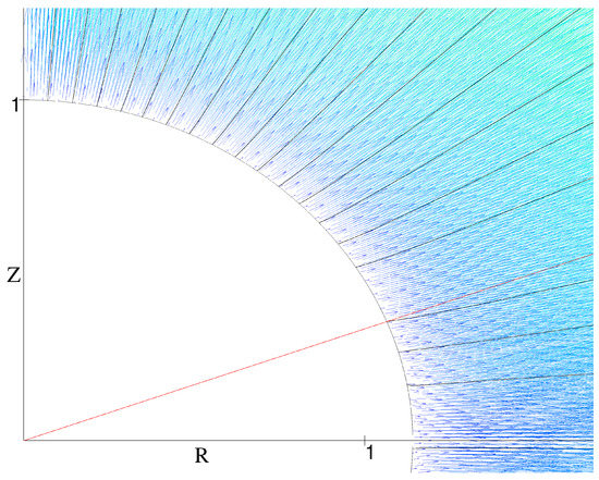 Figure 2 presents the structure of the flow in the upper hemisphere. The most impressive observation is that the flow dramatically differs from the flow obtained by us [39] when the radiative force was neglected. The flow lines are practically radial. However, the flow is not spherically symmetric. The density of plasma at the equator exceeds the density of the plasma at the pole. In this regard, our results reproduce the results of the works [29,49,61], where the radiative force was taken in the same form.
