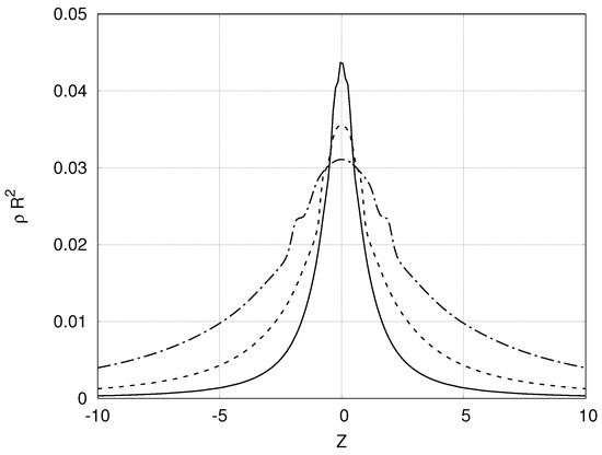 Normalized density along lines across the equator for 3 distances of the lines from the center of the star. Solid line—2; dashed line—4; dashed–dotted line—8 stellar radius. All the geometrical values are expressed in units of radius of the star at the pole . corresponds to the sound velocity . .