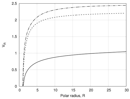 Radial velocity versus polar radius along 3 different radial lines. Solid curve—line along the equator; dashed curve—along the line inclined under to the equator; dashed–dotted curve—along the axis Z.