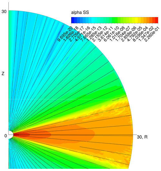 is taken from the solution of equations for k (10) and (11). The color shows in the logarithmic scale. At the stellar surface, achieves a comfortable value of 0.2. However, very quickly, decreases to low values, which already cannot affect the dynamics of the flow. Thus, the turbulence is generated only very closely to the stellar surface. It is advected down stream of the flow with a damp-forming disk-like structure with a full opening angle close to . It is interesting that there is another source of turbulence in the flow. The interaction of the slow radial flow in the disk and fast radial flow in the polar wind leads to the Kelvin–Helmholtz instability amplifying turbulence at the boundary of the disk.
