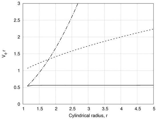 ANSYS CFX package [63] was used for the numerical modeling. The code and the computer model were verified on the problem of the spherically symmetric outflow driven by radiative force from the nonrotating star. For example, we present the dependence of the ratio on R in Figure 1. The calculations were performed for the following parameters: , , (solid line) and (dashed line). According to [62], the maximum of these curves provides the location of the critical radius of the flow. The conditions at define the mass flow rate from the star: in the first case, and in the second case .