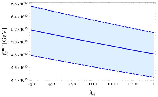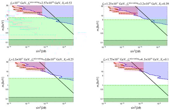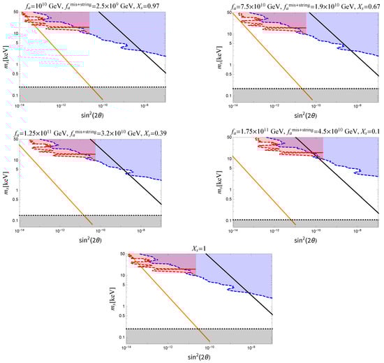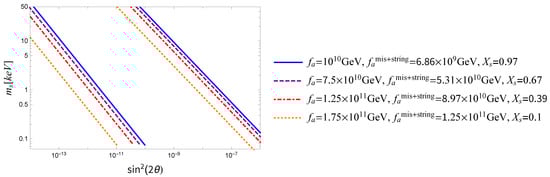 In Figure 4, we show the region corresponding to the resonant sterile neutrino production in the plane varying . The plot includes the non-resonant production mechanism (the upper line) as a limiting case with vanishing lepton asymmetry (see Section 4.1 and Section 4.2). For each value of , we also show the corresponding in two cases. The first case corresponds to a negligible . In the second case, we give the value of the axion decay constant, which we call , taking into account both and for . This is one of the values for which we cannot only account for the whole DM with axions and sterile neutrinos, but we can also reproduce the observed neutrino oscillation phenomenology, baryon asymmetry, have a stable EW vacuum and critical Higgs inflation (in agreement with Planck observations [,]) and solve the strong CP problem []. Note that moderate variations of around this value produce very small changes in because depends on only logarithmically.