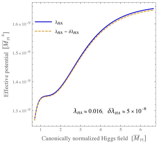 where is the reduced Planck mass, R is the Ricci scalar, and are the non-minimal couplings of H and A to gravity and is the cosmological constant. In our model, the inflaton is identified with the Higgs; it is possible to do so with , as discussed in Ref. [], when we are close to the frontier between the stability and the metastability of the EW vacuum (critical Higgs inflation).