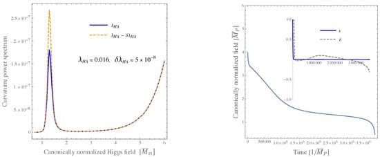 The curvature power spectrum and the canonically normalized (Higgs) field close to criticality (which we approach by varying ). The corresponding values of and are shown as well in an inset of the right plot. The parameters are set as in Figure 30.