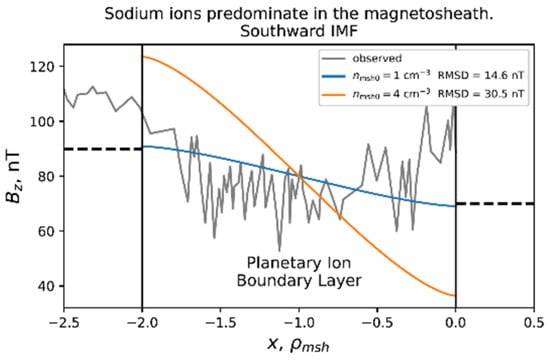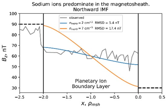Figure 4 demonstrates a comparison of calculations by Equations (4) and (5) with the measurements of Bz during the second MESSENGER flyby presented by Slavin et al. []. From this figure, it follows that the density excess of nmsh = 1 cm−3 gives a suitable result.
