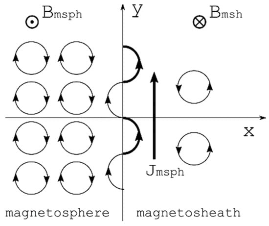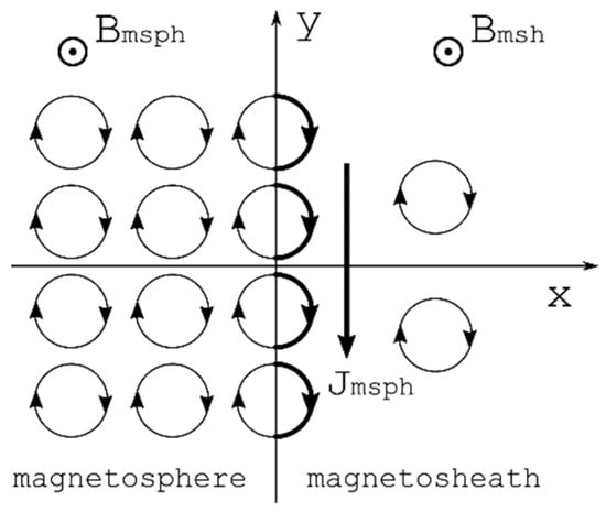 The magnetospheric equatorial plane is presented in the vicinity of the magnetopause considered to be a thin layer coinciding with the Y-axis; the IMF is northward. The X-axis is directed sunward (positive X corresponds to the magnetosheath and negative to the magnetosphere). Jmsh is the diamagnetic current, which we consider to be caused by the positive difference of sodium ion densities in the magnetosheath and magnetosphere (following Figure 2 from []).