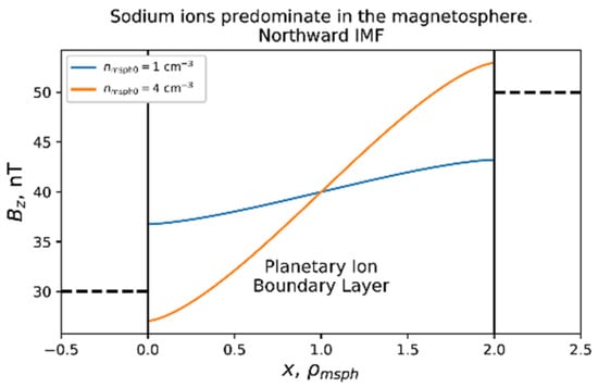 Bz near magnetopause (located at X = 0) for 0 < x < 2ρmsph in the case when the sodium ions dominate in the magnetosphere, and IMF is northward. The calculations of Bz by Equations (4) and (5) for nmsph0 = 1 cm−3 are shown in blue and for nmsph0 = 4 cm−3 in orange.