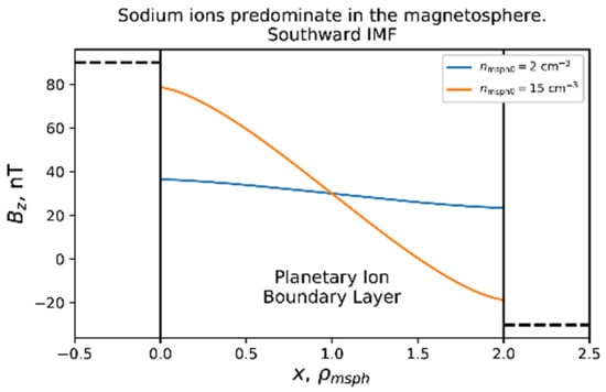 Bz near magnetopause (located at X = 0) for 0 < x < 2ρmsph in the case when the sodium ions dominate in the magnetosphere, and IMF is southward. The calculations of Bz by Equations (4) and (5) for nmsph0 = 2 cm−3 are shown in blue and for nmsph0 = 15 cm−3 in orange.