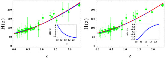 The evolution of the Hubble parameter (blue curve) is shown for the best-fit values of model parameters, as given in Table 1, arising from the joint analysis of + BAO + CMB + BBN + SNIa (Pantheon) dataset (left panel) and + BAO + CMB + BBN + SNIa (Union 2.1) dataset (right panel). Here, the red curve represents the corresponding evolution of in a standard CDM model with , km/s/Mpc [40] (left panel) and , km/s/Mpc [37] (right panel). In this plot, the green dots correspond to the 51 data points in the redshift range , obtained from different surveys and the corresponding values are given in [44]. In the inset diagram, the corresponding relative difference, , is shown for the best-fit model.