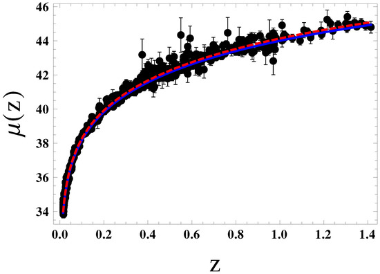 The evolution of is shown for the best-fit values of model parameters, as given in Table 1, arising from the joint analysis of + BAO + CMB + BBN + SNIa (Union 2.1) dataset (blue curve). The CDM model ( and km/s/Mpc [37]) is also shown in the red line for model comparison. Here, represents the distance modulus, which is the difference between the apparent magnitude and the absolute magnitude of the observed supernova, is given by [3] , where is the luminosity distance. In this plot, the black dots correspond to the Error bar plot of 580 points of Union 2.1 compilation Supernovae Type Ia data sets [41].