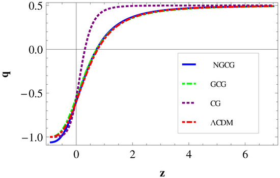 Plot of q as a function of z is shown by considering the values of model parameters, as given in Table 1, arising from the joint analysis of + BAO + CMB + BBN + SNIa (Pantheon) dataset (blue curve). Here, the red, green, and dotted (purple) curves represent the corresponding evolution of q in a standard CDM, GCG, and CG models, respectively.