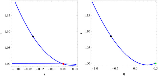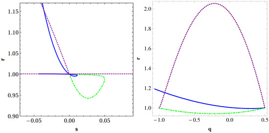 The evolutionary trajectories in s-r plane of holographic dark energy (HDE) model [19,20,21,22,23,24,25] with future event horizon as IR cut off starts from the point and approaches towards CDM fixed point at late time [24]. In the case of a quintessence DE model by taking constant EoS parameter [46,47] and Ricci DE (RDE) model, the curves in s-r plane are vertical [48]. The trajectory in the s-r plane in Chaplygin gas (CG) lie in the regions [49], while the phantom model with power law potential as well as the quintessence (inverse power-law) models (Q) lie in the regions [46,47] and approach the CDM fixed point in both cases at a late time. The trajectory in s-r plane forms a swirl before reaching the attractor in the coupled quintessence models [50]. Both the Agegraphic DE model [51] and Polytropic gas model [52] show the CDM behavior at an early time. The HDE model of DE with the model parameter and the ghost DE model both show the similar behavior in plane [53]. This behavior also matches chaplygin gas [26,27], generalized chaplygin gas [30,31,32,54], Yang–Mills [55], new agegraphic [51,56] and HDE [23,24,25] models of DE. In case of the tachyon DE model [57] and HDE model with Granda–Oliveros IR cut-off (new holographic model) [58], the curve of the s-r plane passes through the CDM fixed point at the middle of the evolution of the Universe. The trajectories of the s-r plane end at the CDM fixed point () at a late time, starting from matter-dominated (SCDM) through an arc segment, parabola (downward) in the case of Tsallis holographic dark energy (THDE) model [59,60]. The evolutionary curve of the s-r plane starts and ends at the CDM fixed point by making a swirl and shows the Chaplygin gas behaviour in the case of an RHDE model [61]. Recently, one of the authors has investigated the statefinder pair of SMHDE model, in which it always lies in Chaplygin gas region and approaches the CDM fixed point () in the late time evolution [62]. The evolutionary curve of the s-r plane starts from a cosmological constant and goes around a corner and proceeds towards another endpoint in case of the Tsallis agegraphic dark energy model [63]. In this work, we have also studied the evolution of the pair for the NGCG model. However, one can also look into [64,65,66], where the authors have comprehensively discussed about the statefinder pair analysis for various DE models.