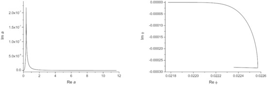 Physically, corresponds to the initial condition of the inflaton field, i.e., the initial condition of an inflationary universe. Therefore, we will eventually examine the probability distribution as a function of . On the other hand, is merely a free parameter. This must be used to satisfy the boundary condition after the Wick-rotation (i.e., to achieve classicality). If we select an appropriate , it may be possible that after the Wick-rotation , the imaginary parts of both a and will approach zero, and the real parts will dominate (e.g., see Figure 1 [10]). Therefore, in other words, is a tuning parameter for the classicality at a future infinity.