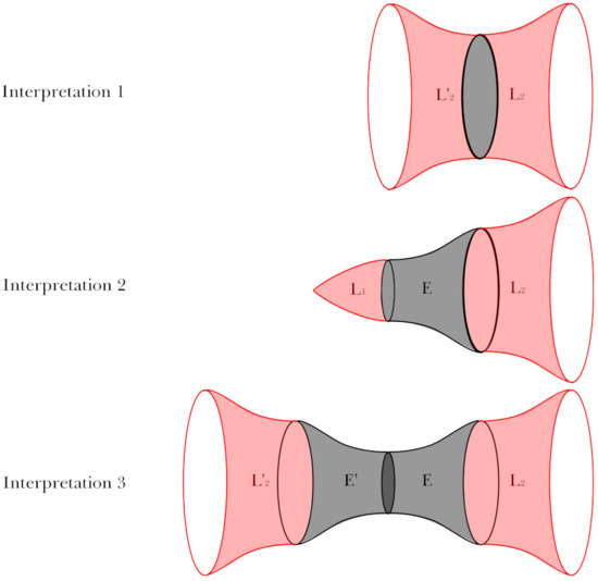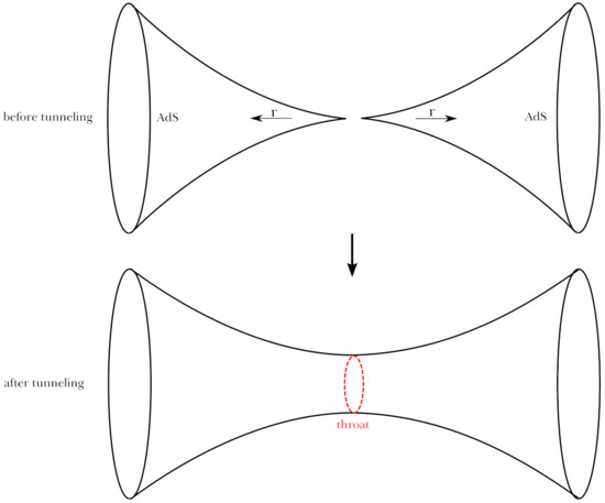 If this finite action difference is allowed, this instanton can explain a case of tunneling from two separate anti-de Sitter spaces to a connected anti-de Sitter wormhole after the Wick-rotation (Figure 9 [35]). This solution satisfies the classicality at the time-like infinity. One potential question is whether any effects from the fuzzy core of the solution can reach a future infinity or not. However, in principle, this solution is embedded in the Euclidean path integral formalism. Therefore, we can very easily extend this technique to anti-de Sitter fuzzy Euclidean wormholes in a black hole background. After the Wick-rotation, this explains a Lorentzian (probably unstable) wormhole in anti-de Sitter space. The existence of this structure can then cause conceptual trouble with the ER = EPR conjecture [37]. We leave these interesting connections to the information loss paradox for future research [38,39].