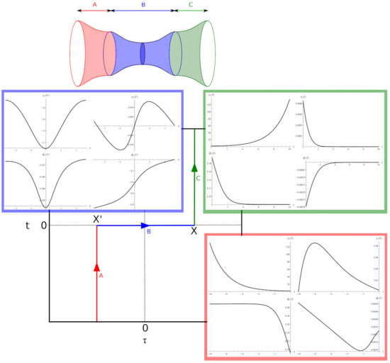 Complex time contours and numerical solution of , , , and for Equation (58). The top figure is the physical interpretation of the wormhole. Part A (red) and C (green) are Lorentzian, and Part B (blue) is Euclidean [27].
