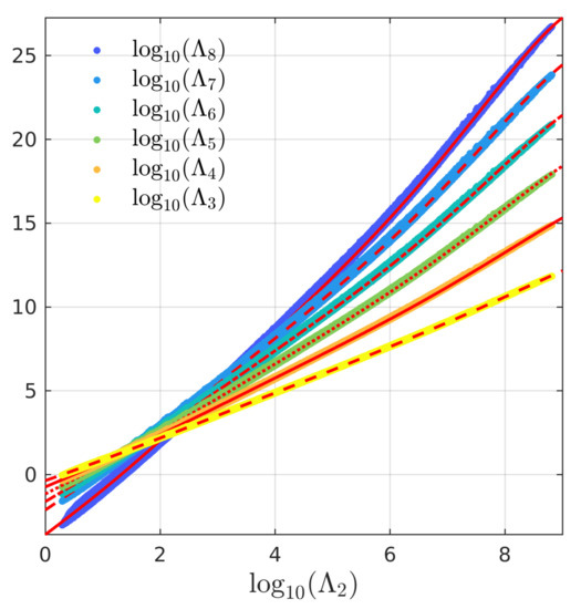 From our phenomenological EOS data set, we compute 21,994,104 valid individual NS solutions to the TOV equation as our statistics for analyzing the multipole Love relations. , , , , , and are plotted against in Figure 1, and one can appreciate the universality of each relation across a vast range of scales. (We observe that all the intersections between the six curves lie around , but we are not sure why this is the case.) As in the authors’ previous work [14], we employ a fitting function of the form