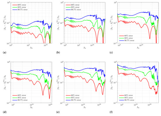 In Figure 2, we show the 68%, 95%, and 99.7% relative error of each fit. For each line in the error plot, the corresponding percentage of data points lie below it. We restrict our attention to the domain , as this is the range of most relevant to current LIGO measurements. The estimate error of each over this range stays mostly flat with a slight downward trend. (The small ripples that can be seen in the error plots over this range are simply artifacts of how the distribution of NS solutions was computed.) The universality of the multipole relations weaken gradually as l increases, as can be seen in the increasing thickness of the distributions in Figure 1. This then increases the maximum estimate error of for larger l despite the faithfulness of each fit to the shape of the corresponding relation (see Figure 1). While 95% of estimate errors are smaller than ∼7% for the – relation, 95% are only smaller than ∼50% for –.