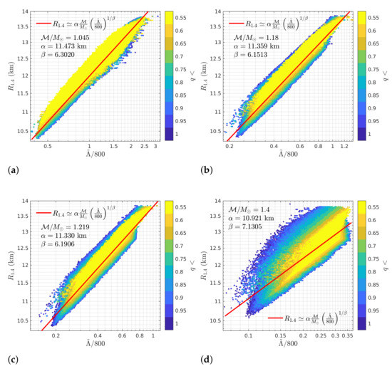 To study the – relation, we follow a similar procedure. First, we choose a fixed value of . Next, for each EOS in a random sample of a quarter of all EOS in the data set, we generate twenty random binary NSs (BNSs). We uniformly sample the binary mass ratio (where ) on the interval . This range is not intended to represent the complete range of values that q could take in Nature, but rather simply to capture the general behavior of q based on observational and theoretical considerations. Observations of the most massive known pulsars indicate that [37,38,39,40,41,42], and the analysis of GW170817 suggests that [43,44,45,46,47]; though, as we await upcoming precision measurements of millisecond pulsar radii by NICER, we cannot as of yet categorically rule out the possibility of extreme EOSs with [48]. Meanwhile, the least massive known pulsar has a mass of [49], and, depending on the true nuclear EOS, the minimum stable gravitational mass, , could be as low as [50]. Hence, , and the vast majority of BNSs, being far from either mass extreme, will fall well within this range.