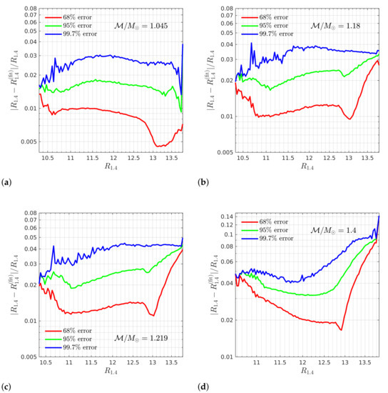 68%, 95%, and 99.7% relative errors of the fits to the - relation for (a) , (b) , (c) , and (d) . The error overall stays below , with 95% of the estimates generally below 4–5% error, for all values of .