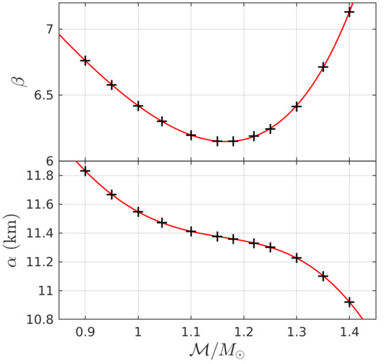 where and are the deformabilities of the primary and the secondary stars, respectively. The quadrupolar tidal Love number is known to scale roughly as independently of the EOS [15,29]. According to Equation (1), this means scales approximately as . In an apparently analogous fashion, seems to go as , where is the chirp mass of the BNS given by