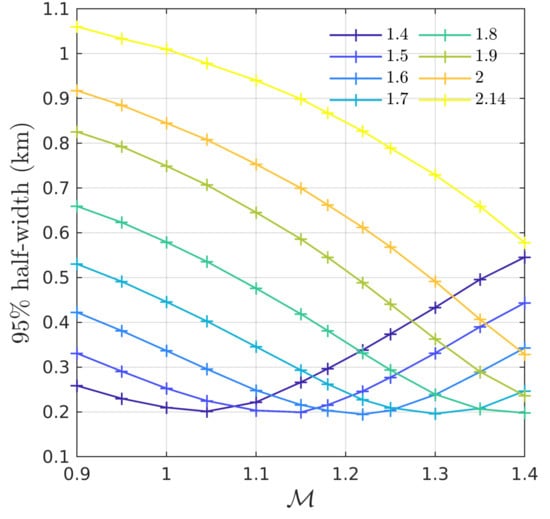 The approximate uncertainty of the estimated value of computed using the – relation as a function of . Each curve is colored according to the value of M (given in units of ). The uncertainty is defined as the half-width of the symmetric interval centered at that encloses 95% of the data points in the histogram of . For every M, there is an optimal value of such that this uncertainty is minimized.