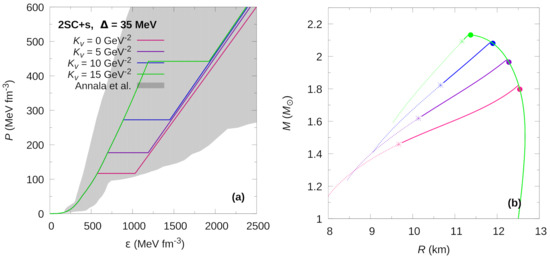 We start by analyzing the effects of varying and values on the EoSs and the mass-radius relationship (M–R) of HSs shown in Figure 1, Figure 2, Figure 3 and Figure 4. All the hybrid EoSs shown in these figures satisfy the constraints presented in [42]; besides, these EoSs have one common characteristic feature, namely that the hadron-quark transition pressure must be larger than about 200 MeV fm so that the -mass constraint condition can be satisfied.