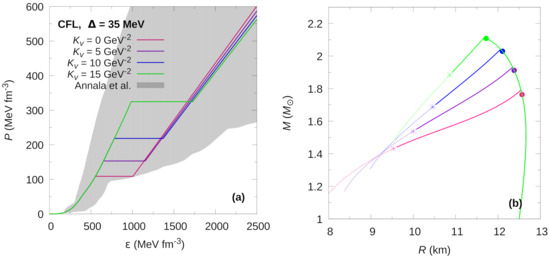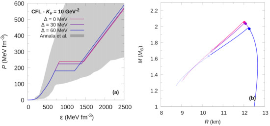 where and are determined by minimizing Equation (20). Color charge neutrality is imposed by the conditions . The breaking of color symmetry increases the number of coupled equations that are to be solved in order to compute the quark matter EoS. The system of equations consists of nine coupled equations for the 2SC+s phase and twelve coupled equations for the CFL phase.