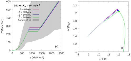 In Figure 3 and Figure 4, we present the EoSs and M–R relationships of HSs with 2SC+s and CFL matter in their cores, but for which the value of is kept constant while the diquark energy gap taken on several different values. We can see that varying the value of in the 2SC+s phase has little impact on the hybrid EoS. For the CFL phase, however, the impact is more pronounced. In both cases, the speed of sound in the quark superconducting phase does not change significantly with changes in . An increase in leads to a somewhat smaller changes in energy density in the transition region. This effect is more noticeable in the CFL phase than in the the 2SC+s phase. The main differences appear in the transition pressure where a higher value of leads to a lower transition pressure. This, of course, has consequences for the appearance of superconducting quark cores in HSs and, in particular, reverberates on the extended stable branch of HSs, panels (b) of Figure 3 and Figure 4. One common feature is that the increase of the value of leads to a shortening of the extended branch of stable compact objects.