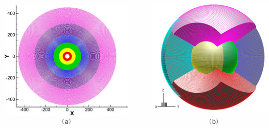 Our calculation domain is set to be from 0.1 AU to about 2 AU from the Sun’s center, exactly [21.5, 450] in units of solar radius (). The meshes in the radial direction are divided by equal ratio, so the meshes become larger with the increase in heliocentric distance. The radial mesh size increases gradually from 0.37 to 3.6. The allowable time step will be larger as the grid is larger, according to the Courant–Friedrichs–Lewy (CFL) conditions of numerical calculation. Therefore, we divide the whole computing space into six regions in the radial direction, and each region uses its own allowable time step, so that asynchronous parallel method can be adopted in the calculation to save the calculation time [15]. The division of radial grids is shown in Figure 1a. Different colors represent six different regions divided radially. There are 48 grid point in each region, and 4 of them overlap with the nearby region. The number of grids in the radial direction can be adjusted as needed to obtain the appropriate calculation area.