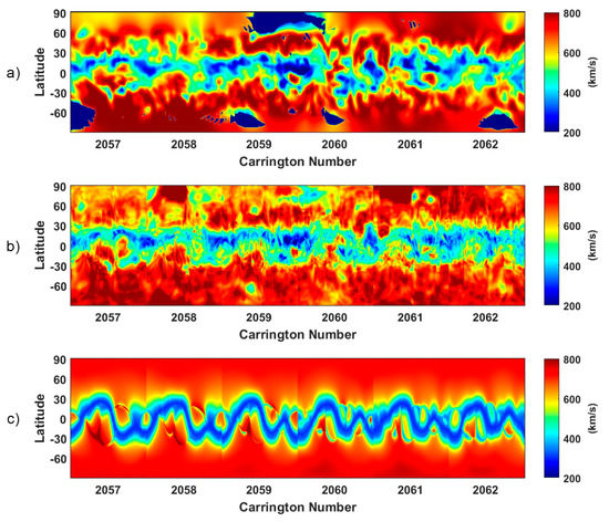 - Arge, C.N.; Odstrcil, D.; Pizzo, V.J.; Mayer, L.R. Improved Method for Specifying Solar Wind Speed Near the Sun. AIP Conference Proceedings; AIP Publishing LLC: Melville, NY, USA, 2003; Volume 679, pp. 190–193. [Google Scholar]