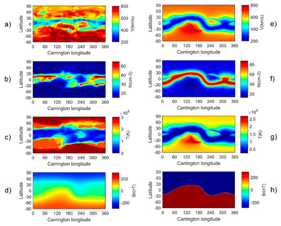 The global distribution of (a) velocity (Vr), (b) density (N), (c) temperature (T) and (d) radial magnetic field (Br) at the inner-boundary derived from the new method using multiple observations and ANN, and the global distribution of (e) Vr, (f) N, (g) T, and (h) Br derived from the method only based on the WSA model during CR2062. The x axis is the Carrington longitude, and the y axis is the latitude.