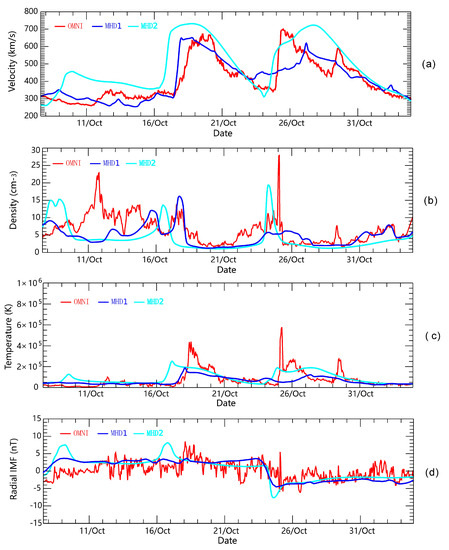 In order to examine if the small scale variations simulated by our new MHD model are closer to the actual solar wind environment than the previous model, we compared the modeling results with the in situ observations at 1AU provided by OMNIweb (http://omniweb.gsfc.nasa.gov, accessed on 30 September 2021), and the results are shown in Figure 6. and Table 1.