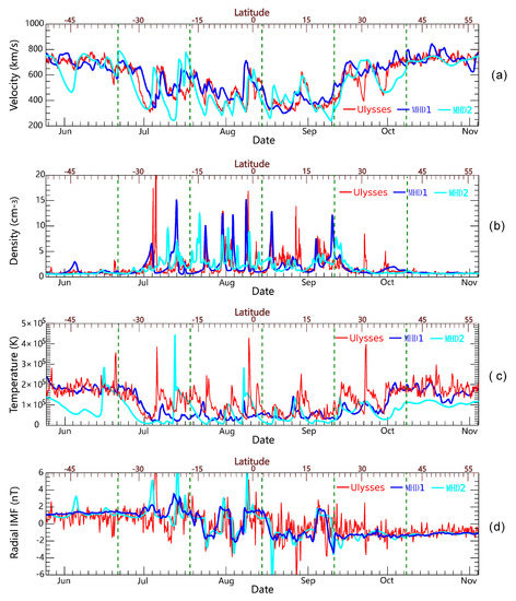 Then, if we focus on the latitudes above ±15 degree, the modeling results of our new MHD model coincide with the Ulysses observations better than the previous MHD model for all the solar wind parameters, intuitively. The most obvious improvement is in the temperature at high latitudes, since both the observation and the new MHD model presented the temperature as around 2 below −30 latitude degrees and above 35 degrees, but the previous model presented much lower values. However, the two large dips in speed and the corresponding impulses of density observed by Ulysses during late September to the beginning of October in Figure 8a,b were not well reproduced by both our MHD models. According to the theoretical studies on the quasi-stationary current sheets [64,65], these differences might be caused by the large-scale current sheets at mid-heliolatitudes that are not reproduced by our models, as we can see the inversions of the radial magnetic field direction are only presented by the observational data in Figure 8d.