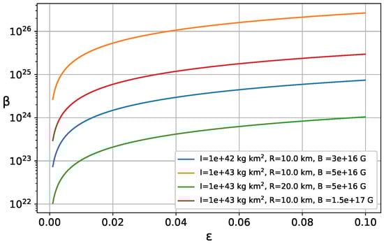 Expected evolution of the dimensionless parameter with ellipticity for the free parameters radius , magnetic field , and moment of inertia . The parametric valuesare exhibited in the figure.